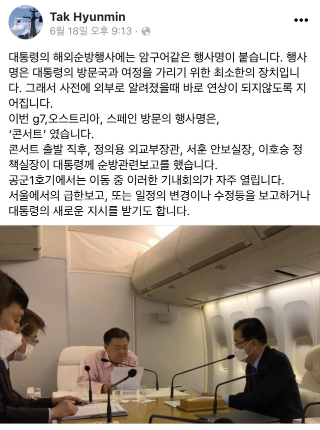 탁 비서관은 지난 18일 페이스북을 통해 문 대통령의 유럽 3개국 순방 뒷이야기를 전하며 순방 암구호가 '콘서트'였다고 밝혔다. 이를 두고 '암구호는 3급 국가비밀에 해당한다'는 등 보안 수칙 위반 논란이 불거졌다.