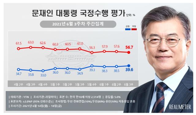리얼미터가 발표한 여론조사(YTN 의뢰로 지난 14~18일까지 전국 만 18세 이상 성인 2514명을 대상으로 실시) 결과에 따르면, 문 대통령 지지율은 지난주보다 1.1%포인트 상승한 39.6%로 나타났다. 부정평가는 전주대비 0.9%p 하락한 56.7%를 기록했다.