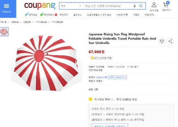 22일 유통업계에 따르면 쿠팡에는 욱일기가 그려진 스티커, 우산 등이 판매되고 있었다. 해당 상품들은 해외 배송 상품으로 오픈마켓 판매자가 등록한 것으로 알려졌다.