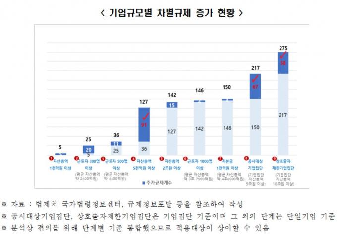 '기업규제 3법' 영향…신설규제 87개 중 75%, 대기업집단 대상 기업 규모별로 차등 적용되는 '대기업 차별규제'가 2년 전에 비해 크게 늘었다는 분석이 나왔다.