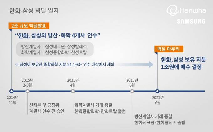 한화는 지난 2015년 삼성으로부터 방산·화학 계열 4개사를 약 2조 원에 인수하는 '빅딜'을 성사시켰다. 당시 삼성종합화학(현재 한화종합화학)에 남아있던 삼성 측 지분을 이번에 한화가 모두 인수하면서 두 그룹의 빅딜은 6년 만에 마무리됐다.