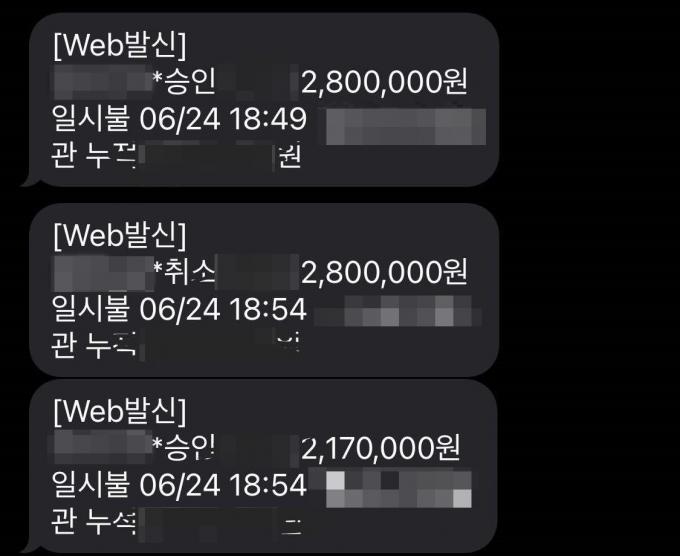 동행한 B 씨는 떼인 가격표를 보고 "방금 280만 원 결제하지 않았냐, 근데 가격택엔 217만 원"이라고 알려줬다. 이에 A 씨가 바로 상품 가격이 217만 원 아니냐고 되묻자, 직원은 당황한 기색으로 "잘못 본 것 같다"며 결제를 취소하고 217만 원을 다시 결제했다. 직원은 A 씨의 의사를 묻지 않고 "280만 원짜리 취소 영수증은 버려드리겠다"고 말했다.