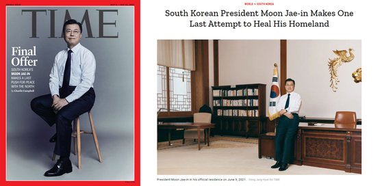 ▲청와대는 문재인 대통령이 지난 9일 청와대 본관 집무실에서 미국 주간지 '타임' 표지 촬영과 화상인터뷰를 했다고 24일 밝혔다. 사진은 타임지 표지와 인터넷판 기사. [타임 캡처]