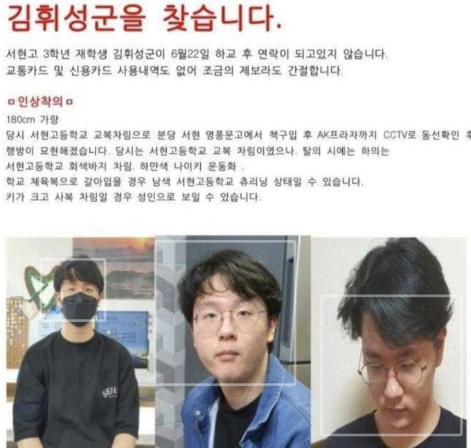 26일 경기 분당경찰서에 따르면,서현고 3학년 김휘성 군이 지난 22일 오후 4시 40분 하교 후 닷새째인 이날까지 연락이 두절됐다.이튿날 새벽 김 군 가족으로부터 실종 신고를 접수한 경찰은 수색에 나섰으나, 아직 뚜렷한 단서는 찾지 못했다.