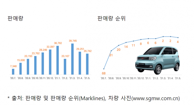 28일 한국자동차연구원에 따르면 상하이 기차, GM, 우링 기차 등 3개 자동차 기업이 합작 설립한 SGMW에서 지난해 7월말 출시한 전기차 우링 홍광 미니의 판매량이 급속도로 증가하고 있다. 지난해 하반기 출시됐음에도 12만7000대가 팔리며 현지 전기차 판매 2위를 기록했다. 중국 전기차 1위는 13만7000대가 팔린 테슬라 모델3다.