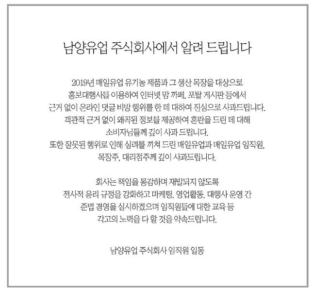 남양유업은 지난 29일 오후 홈페이지에 사과문을 올려 "2019년 매일유업 유기농 제품과 그 생산 목장을 대상으로 홍보대행사를 이용해 인터넷 맘카페, 포탈 게시판 등에서 근거 없이 온라인 댓글 비방 행위를 한 데 대해 진심으로 사과드린다"는 사과문을 게시했다