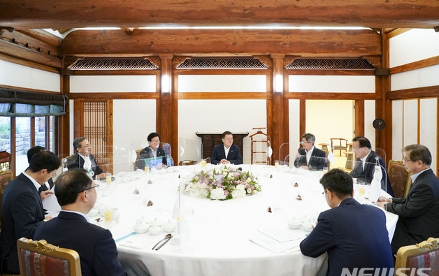 ▲문재인 대통령이 30일 청와대 상춘재에서 열린 헌법기관장 초청 오찬 간담회에서 참석자들과 환담하고 있다. [뉴시스]