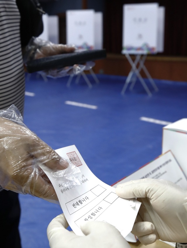 ▲ 30일 경기 과천시 부림동 주민센터에 설치된 투표소에서 김종천 시장에 대한 주민소환투표가 진행되고 있다. [뉴시스]