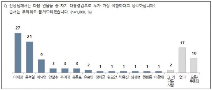 국민의힘 내에서의 지지도도 높다. 국민의힘 지지층에서 윤 전 총장 지지율은 55%로 과반이다. 홍 의원은 6%, 유 전 의원 2%, 황 전 대표 2%, 원 지사는 1%다.