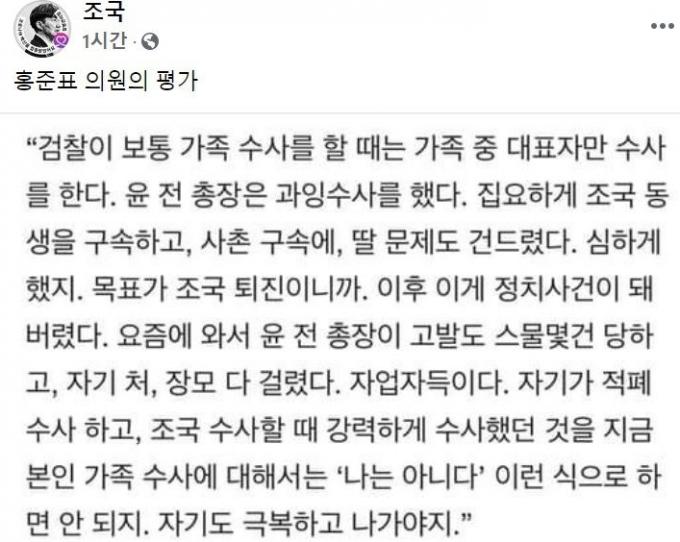 조 전 장관은 이날 페이스북에 홍 의원 인터뷰 내용을 공유했다. 그러면서 "홍준표 의원의 평가"라고 적었다. 공감을 표시한 것이다. 지난 3월에도 홍 의원 페이스북 글을 올려 응원한 바 있다.