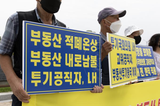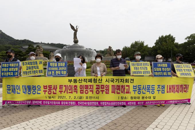 2일 서울 청와대 앞에서 부동산적폐청산시민행동 관계자들이 '부동산적폐청산 시국 기자회견'중 피켓 시위를 벌이고 있다. 이들은 "문재인 대통령은 부동산 투기 의혹 임명직 공무원 파면하고, LH해체하라"라고 촉구했다.