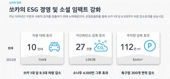 16일 쏘카에 따르면 쏘카는 최근 10년간 꾸준히 사회적 효과를 내기 위해 노력한 결과 현재 연간 27만 톤(t)의 이산화탄소 감축 효과를 거뒀다.