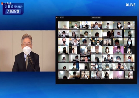 이 후보는 이날 비대면 기자간담회를 열고 1시간 30분 넘게 질의응답을 했다. 기본소득, 경제 대전환 구상, 부동산 정책 등 정책 현안과 검찰의 조국 전 법무부 장관 수사에 대한 의견 등을 밝혔다.