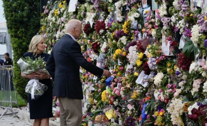 바이든, 아파트 붕괴 현장 임시 추모소에 헌화