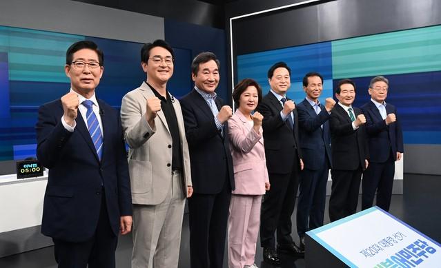 ▲ 더불어민주당 대선 경선 예비후보들이 5일 서울 마포구 JTBC 스튜디오에서 열린 TV 토론회에 앞서 기념촬영을 하고 있다. 왼쪽부터 양승조, 박용진, 이낙연, 추미애, 김두관, 최문순, 정세균, 이재명 후보. [뉴시스]