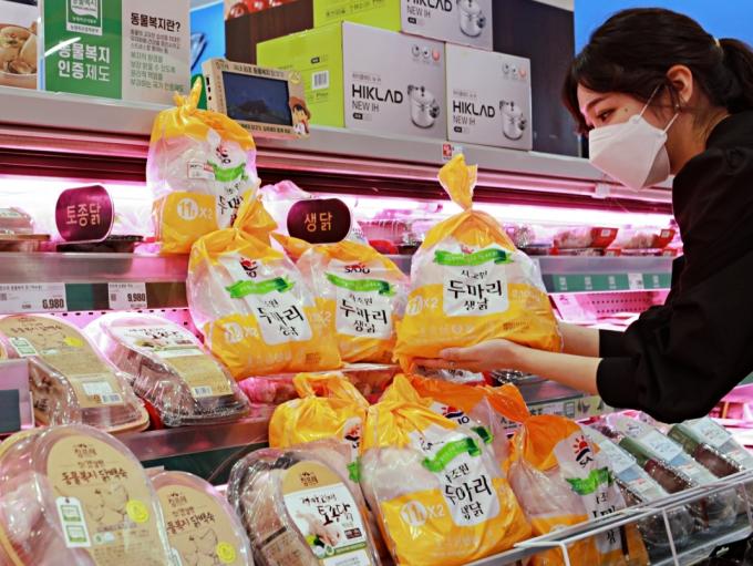 ▲ 한 소비자가 마트에서 삼계탕을 고르고 있다. [롯데쇼핑 제공]