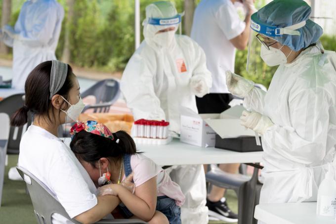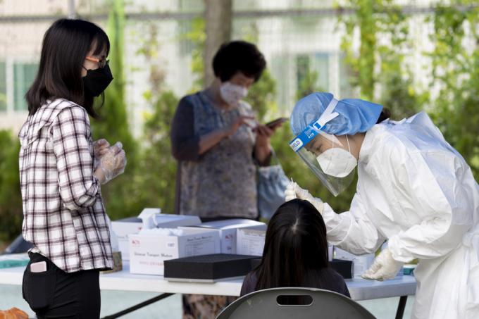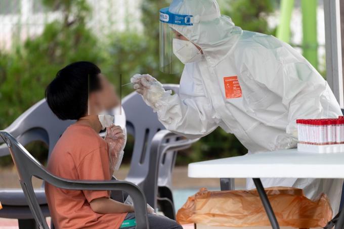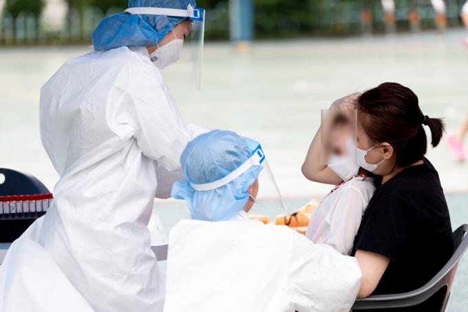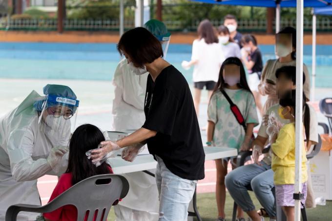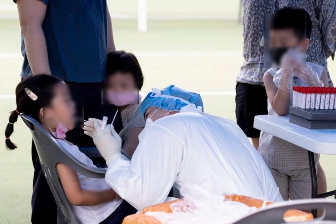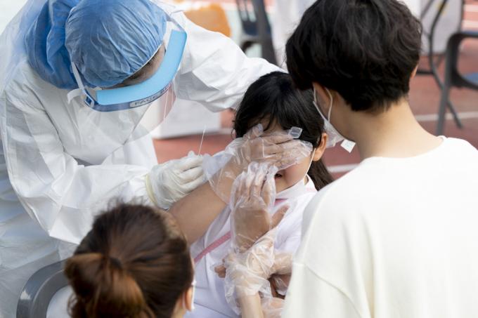 6일 코로나19 집단감염이 발생한 인천시 미추홀구 인주초등학교에서 한 어린이가 검사받는게 무서운지 울고 있다.