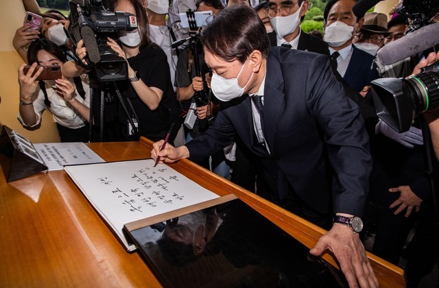 윤 전 총장은 이날 국립대전현충원 참배로 '윤석열이 듣습니다'라는 민심투어를 시작했다. 오전엔 현충탑, 천안함 46용사 묘역, 한주호 준위 묘소, 연평해전 전사자 묘역을 차례로 참배한 뒤 자신의 이름을 새긴 조화를 헌화했다.