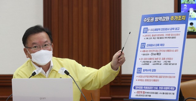 김부겸 국무총리는 7일 중앙재난안전대책본부 회의에서 "안타깝게도 수도권의 코로나19 확산세가 더 거세졌다. 전국 확진자의 85%가 수도권에서 나오고 있다"면서 수도권에서 현행 거리두기를 일주일 더 유지하겠다고 밝혔다.