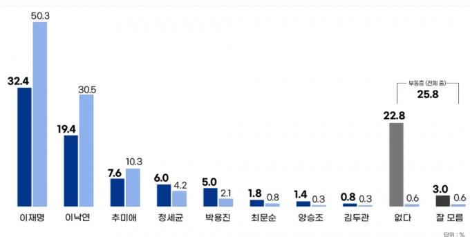 與 후보선호 이재명 32.4% 이낙연 19.4% 추미애 7.6%