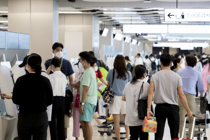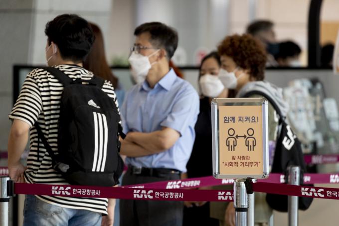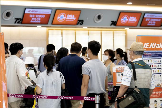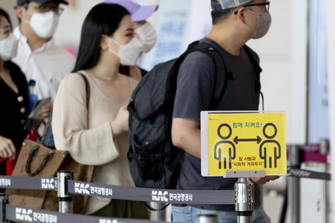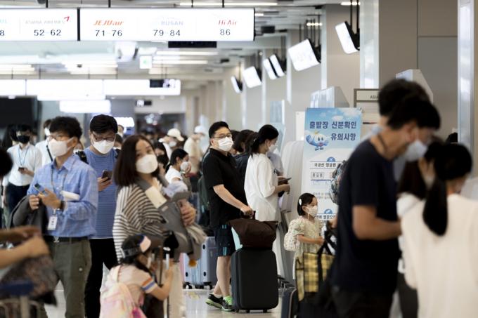 코로나19 신규 확진자 수가 0시 기준 1275명으로 역대 최다를 기록한 8일 김포공항 국내선 탑승 수속장이 이용객들로 붐비고 있다.