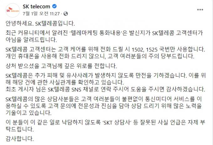 해당 녹취록이 퍼지며 논란이 확산되자 SK텔레콤은 공식 페이스북을 통해 "최근 커뮤니티에서 알려진 텔레마케팅 통화 내용은 발신지가 SK텔레콤 고객센터가 아니다"라며 "고객센터에서는 전화할 때 1502·1525 국번만 사용하고 개인 휴대폰을 사용해 전화하지 않는다"고 해명했다.