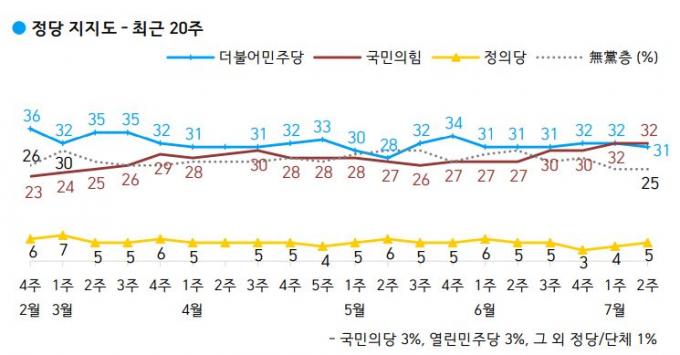 한국갤럽이 이날 발표한 여론조사(지난 6~8일 전국 만 18세 이상 1000명 대상 실시)에서 국민의힘은 32%, 민주당은 31%를 기록했다.