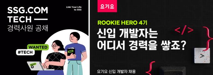 ▲ SSG닷컴의 경력 개발자 채용 포스터(왼쪽), 요기요의 신입 개발자 채용 프로그램 포스터 [각 사 제공]