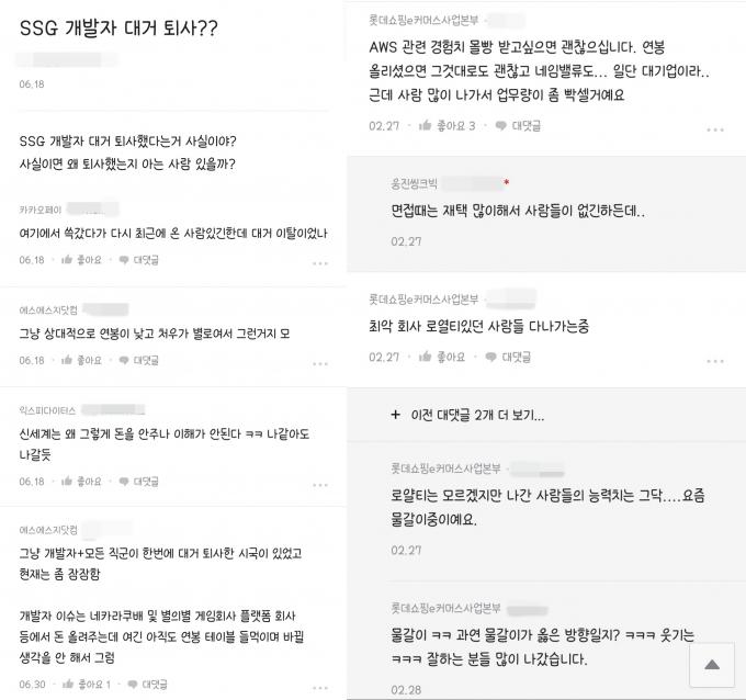 ▲ 직장인 익명 커뮤니티인 블라인드에 게시된 SSG닷컴 개발 인력 관련 글(왼쪽), 롯데쇼핑이커머스사업본부 개발 직군 관련 글 [블라인드 캡처]