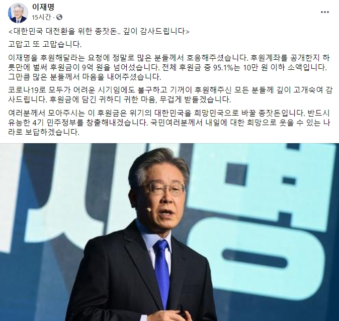 이 지사는 페이스북을 통해 "대한민국 대전환을 위한 종잣돈"이라며 "깊이 감사드린다"고 밝혔다.