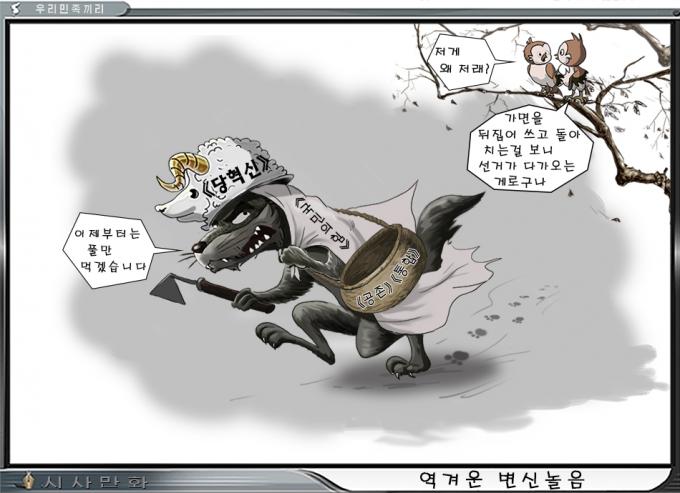 12일자 우리민족끼리 만평을 보면, '당혁신'이라는 양의 탈을 쓴 늑대가 '공존'과 '통합'의 바구니를 메고 손에 호미를 쥐고 "이제부터는 풀만 먹겠습니다"라고 하자, 나무에 앉은 새들이 "저게 왜 저래?"라고 비아냥거리는 모습이다. 국민의힘의 변신을 '양두구육'에 빗댄 것이다.