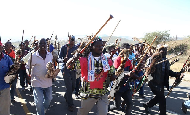 ▲ 제이콥 주마 전 남아프리카공화국 대통령의 지지자들이 지난 1일(현지시간) 콰줄루나탈 주 은칸들라에 있는 그의 자택을 향해 행진하고 있다. [뉴시스]