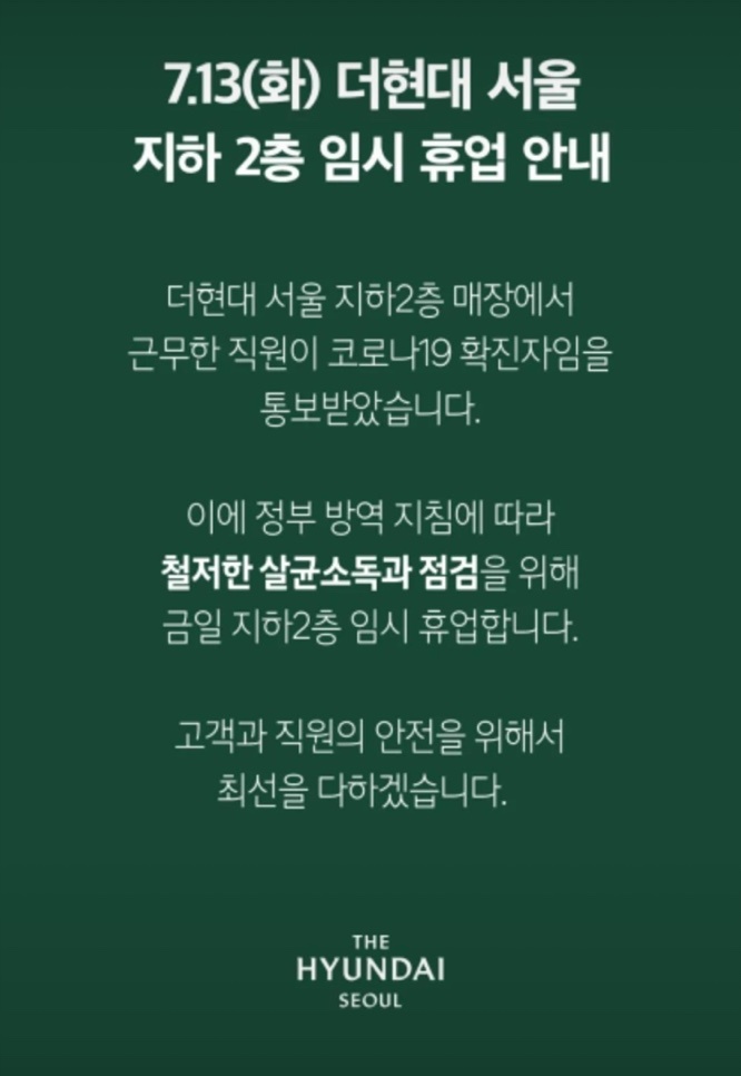 현대백화점은 당초 지난 7~8일 이틀간 휴점하려 했으나, 추가 확진자가 속출하자 정기휴점일인 12일까지 임시 휴업하기로 했다.