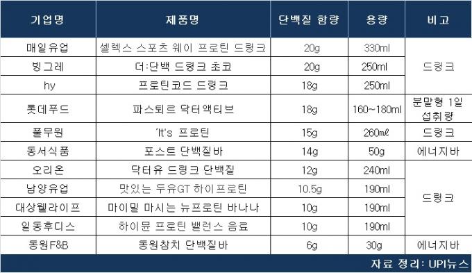 UPI뉴스가 11개사의 단백질 관련 제품의 단백질 함량을 조사한 결과, 매일유업의 '셀렉스 스포츠 웨이 프로틴 드링크(330ml) '와 '빙그레 '더:단백 드링크 초코(250ml)'가 단백질 함량 20g으로 가장 많았다.