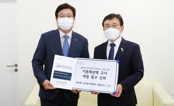 ▲ 지난달 29일, 염태영 수원시장(왼쪽)이 권덕철 보건복지부 장관에게 건의문을 전달하고 있다. [수원시 제공]