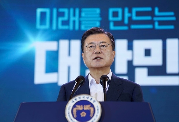 ▲문재인 대통령이 14일 청와대 영빈관에서 열린 '한국판 뉴딜 2.0  미래를 만드는 나라 대한민국'에서 기조연설을 하고 있다. [뉴시스]