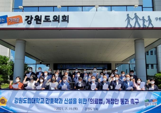 강원도의회 의원 일동은 15일 간호학과 신설의 실질적 장벽을 제거하기 위해 정부와 국회가 조속히 의료법 개정에 나설 것을 촉구했다.