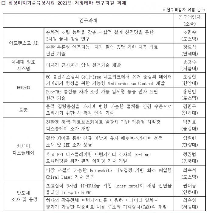 삼성전자는 삼성미래기술육성사업 일환으로 2014년부터 국가적으로 연구가 필요한 미래 과학기술 분야 발전을 위해 지정테마 과제를 선정·지원하고 있다. 올해를 포함해 현재까지 총 103건의 연구 과제에 1059억3000만 원을 지원했다.
