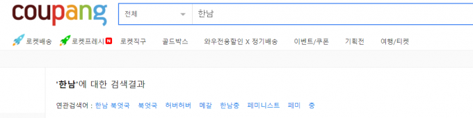11번가, G마켓 등 다른 온라인 마켓에서는 볼 수 없는 현상 쿠팡은 거대 온라인 시장이다. 정치나 이념의 공론장이 아니다. '한남충'이나 '메갈'과 같은 논쟁적 용어들이 등장할 이유가 없다. 그런데 버젓이 연관검색어로 등장한다. 다른 온라인 마켓에서는 볼 수 없는 현상이다.