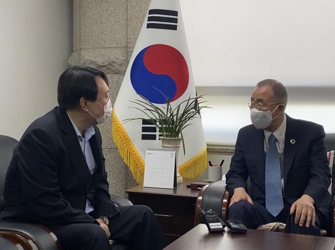 윤석열 전 검찰총장이 15일 반기문 전 유엔 사무총장을 비공개로 만났다. 2017년 대선에 도전했다 한 달 만에 중도 하차한 반 전 총장은 윤 전 총장에게 "그 때 정치상황과 지금은 매우 다르다"고 말한 것으로 알려졌다.