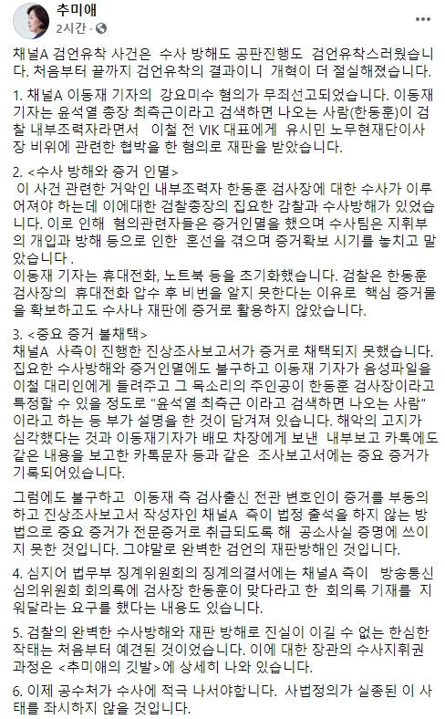 앞서 추 전 장관은 검언유착 사건에 대해 대검찰청 지휘부와 서울중앙지검 수사팀이 이견을 보이자, 윤석열 전 검찰총장이 관여하지 말라는 취지의 수사지휘권을 발동한 바 있다. 추 전 장관은 해당 사건에 대해 "증거가 차고 넘친다"고 주장했었다.