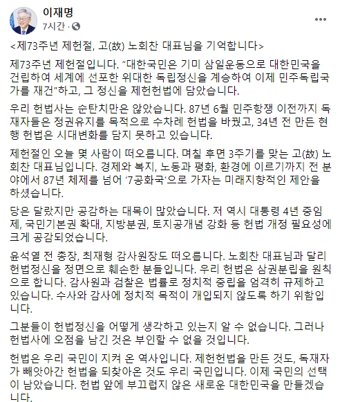 그러면서 제헌절인 이날 떠오르는 인물로 고(故) 노회찬 의원을 언급했다. 그는 "며칠 후면 3주기를 맞는 故 노회찬 대표는 1987년 헌법 체제를 넘어 '7공화국'으로 가자는 미래지향적인 제안을 했다"며 "당은 달랐지만 공감하는 대목이 많았다"고 평가했다.