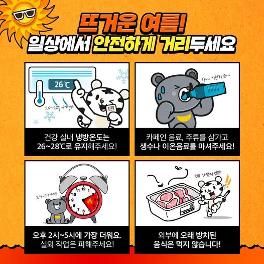 외출 전 기온을 확인하여 폭염 시에는 외출을 자제하거나 양산이나 모자 등으로 햇볕을 차단하고, 작업 시에는 건강상태를 살펴 충분한 휴식과 수분 섭취 등 폭염대비 건강수칙을 준수해야 한다.