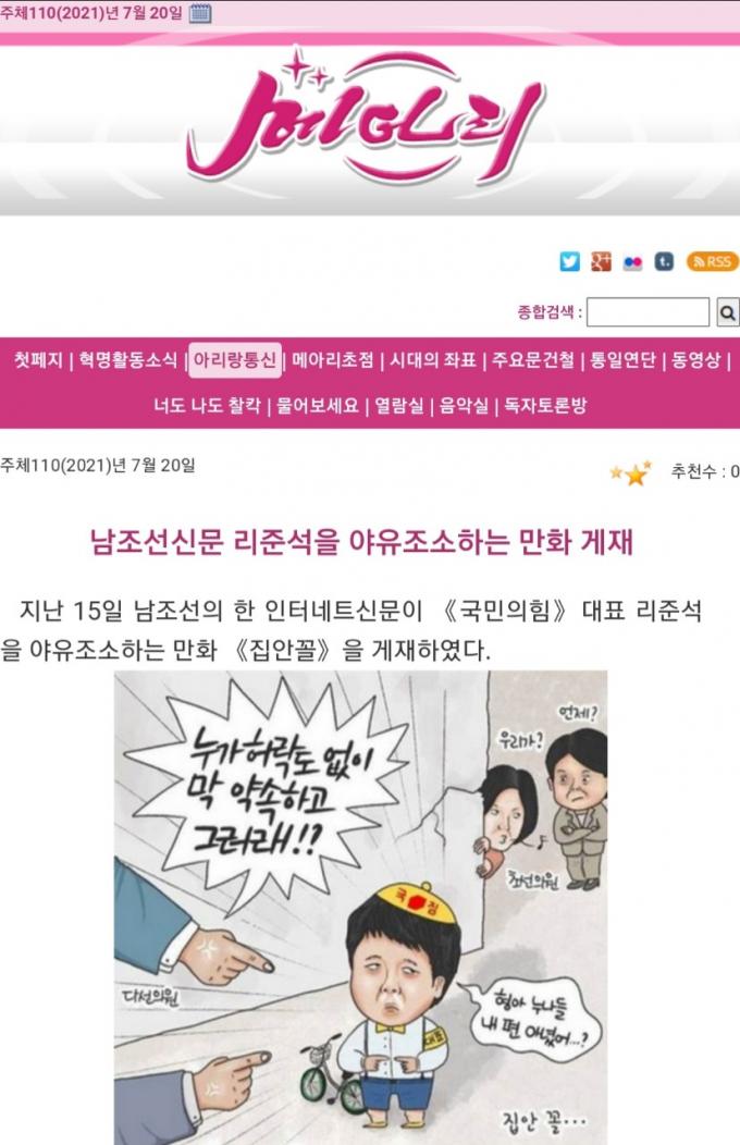 북한의 아리랑협회가 발행하는 선전매체 '메아리'는 20일 "남조선의 한 인터넷신문이 국민의힘 대표 리준석을 야유조소하는 만화 '집안꼴'을 게재했다"며 이 만평을 소개했다.