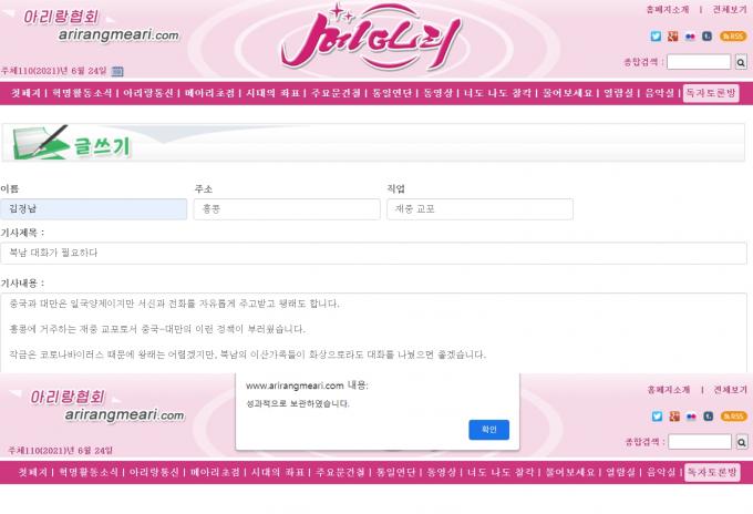 ▲ 기자가 '홍콩에 거주하는 재중 동포'가 홍콩에서 접속한 것처럼 인터넷 우회접속을 통해 독자토론방에 토론글을 작성해 보니 "성과적으로 보관하였습니다"라는 관리자의 안내문이 뜨지만, 글이 게재되지는 않았다. [메아리 캡처]