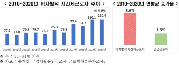 이 기간 비자발적 시간제근로자 연평균 증가율은 3.6%로, 전체 임금근로자 연평균 증가율인 1.3% 보다 2.8배 더 높은 것으로 집계됐다.