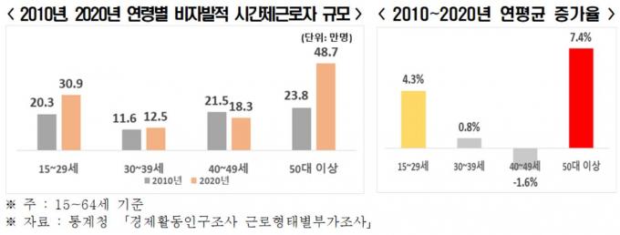 연령대별 비자발적 시간제근로자 추이를 보면, 50대 이상이 2010년 23만8000명에서 2020년 48만7000명으로 연평균 7.4%씩 늘어나 가장 높은 증가율을 보였다.