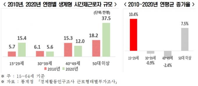 생계형 시간제근로자 추이를 연령대별로 분석한 결과, 청년층(15~29세)이 2010년 5만7000명에서 2020년 15만4000명으로 연평균 10.4%씩 늘어나 가장 높은 증가율을 보였다.