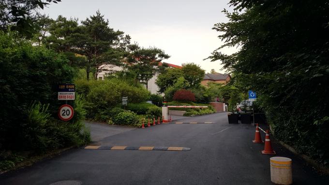정 부회장 가족이 사는 이 마을엔 전직 은행장을 비롯해 건설회사 대표, 대기업 임원, 의사 등 전문직 종사자 등이 거주하고 있다. 마을 입구엔 '조용한 주거지역입니다' '주민스티커 미부착 외부차량 주차금지' 등이 적힌 안내 표지판이 세워져 있다. 바로 옆 도로엔 과속방지턱이 설치돼 있다. 안내 표지판에서 5m 가량 떨어진 곳엔 차량 통행 차단기가 설치돼 있다. 차단기엔 폐쇄회로(CC) TV가 부착돼 있다. '외부 차량은 돌아가시오'라는 안내 문구도 나온다. 이 차단기 아래 도로에도 과속방지턱이 솟아 있다. 차량 진입과 주·정차를 막는 돌 말뚝(볼라드·bollard)도 10여 개 박혀있다.