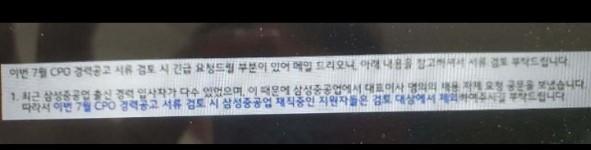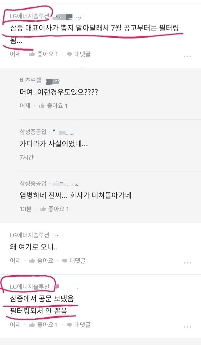 삼성중공업 대표 명의 공문을 수령한 쪽에서 인력채용 담당에게 보낸 메일로 추정된다. LG에너지솔루션 직원 A 씨는 "삼중 대표가 뽑지말래서 7월 공고부터는 필터링되어 삼중 경력직들은 채용되지 않은 걸로 알고 있다. 이미 회사 내부에서는 이 문제로 직원들이 쉬쉬하는 분위기다"라고 말했다.